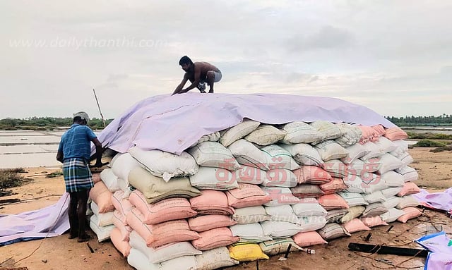 அதிராம்பட்டினத்தில் தொடர் மழை காரணமாக உப்பு மூட்டைகளை பாதுகாக்கும் பணி தீவிரமாக நடந்து வருகிறது. மேலும் உற்பத்தி பாதிக்கப்பட்டு உள்ளதால் தொழிலாளர்கள் கவலை அடைந்து உள்ளனர்.