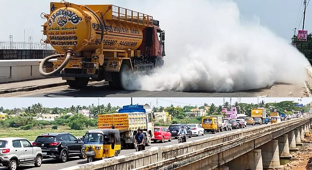 கடலூரில் இருந்து நேற்று மதியம் செப்டிக் டேங்க் லாரி ஒன்று பெரிய கங்கணாங்குப்பம் நோக்கி சென்றது. அந்த லாரியை கடலூரை சேர்ந்த செல்வராஜ் என்பவர் ஓட்டினார். கடலூர் தென்பெண்ணையாற்று பாலத்தில் சென்ற போது, லாரியின் முன்பகுதியில் இருந்து திடீரென புகை வெளியேறியது. இதனால் டிரைவர் நடுரோட்டிலேயே லாரியை நிறுத்தினார்.