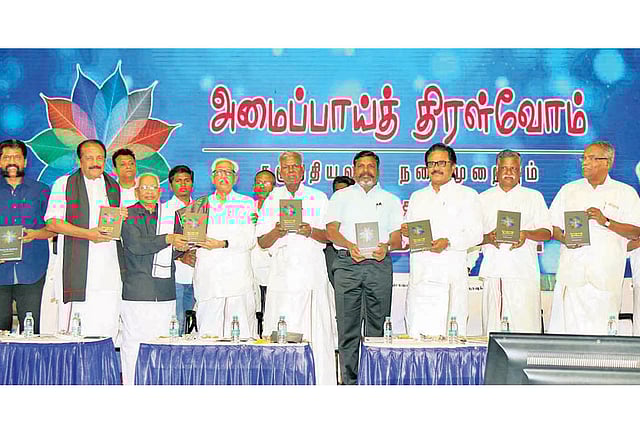 விடுதலை சிறுத்தைகள் கட்சி தலைவர் தொல்.திருமாவளவன் எழுதிய அமைப்பாய்த் திரள்வோம் என்ற புத்தகத்தின் வெளியீட்டு விழா சென்னையில் நேற்று மாலை நடைபெற்றது. இந்திய கம்யூனிஸ்டு கட்சியின் மூத்த தலைவர் ஆர்.நல்லக்கண்ணு தலைமை தாங்கினார். தி.மு.க. பொதுச்செயலாளர் க.அன்பழகன் புத்தகத்தை வெளியிட, திராவிடர் கழக தலைவர் கி.வீரமணி பெற்றுக்கொண்டார்.