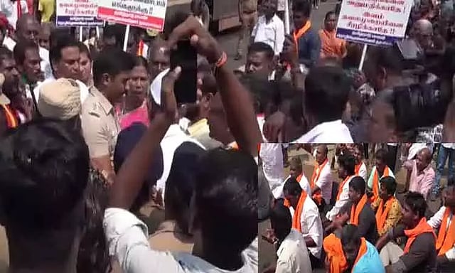 இது குறித்து தகவலறிந்த போலீசார் போராட்ட நபர்களிடம் பேச்சு வார்த்தையில் ஈடுபட்டனர். இருப்பினும் போராட்டம் தொடர்ந்து நடத்தப்பட்டதால் போலீசார் திடீரென அங்கிருந்தவர்களை வலுக்கட்டாயமாக கைது செய்தனர். இதனையடுத்து அனைவரையும் வேனில் ஏற்றி தனியார் கல்யாண மண்டபத்தில் தங்க வைத்து பின்னர் விடுவிக்கப்பட்டனர். இதனால் அப்பகுதியில் பெரும் பரபரப்பு ஏற்பட்டது.