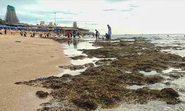 திருச்செந்தூர் சுப்பிரமணிய சுவாமி கோவில் அருகே நேற்று காலை திடீரென கடல் சுமார் 50 அடி தொலைவுக்கு உள்வாங்கியது. இதனால் பாசி படிந்த பாறைகள் வெளியே தெரிந்ததை படத்தில் காணலாம். பின்னர் மதியம் கடல் தண்ணீர் மீண்டும் இயல்பு நிலைக்கு திரும்பியது.