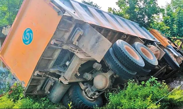 திருவள்ளூர் அடுத்த தச்சூர் முதல் ஆந்திர மாநிலம் சித்தூர் வரை 6 வழிச்சாலை அமைக்கப்பட்டு வருகிறது. இதற்காக பள்ளிப்பட்டு பகுதியில் தேவையான மண்ணை கொண்டு வருவதற்காக டிப்பர் லாரிகள் உபயோகப்படுத்தப்பட்டு வருகின்றன. நேற்று அதிகாலை 4 மணி அளவில் காலி டிப்பர் லாரி பள்ளிப்பட்டு அடுத்த நெடியம் கிராமம் வழியாக வந்து கொண்டிருந்தது.