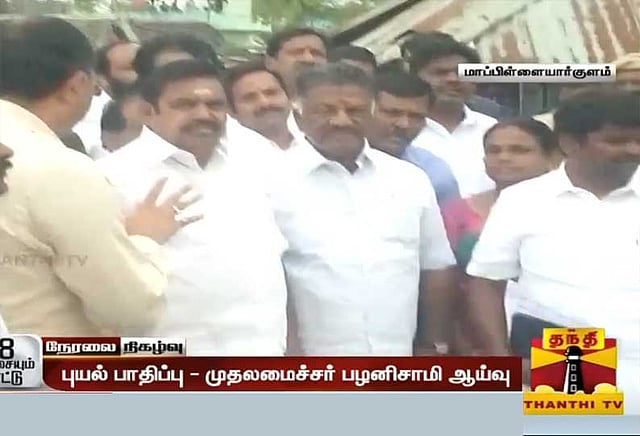 இந்நிலையில், டெல்டா மாவட்டங்களில் புயல் சேதத்தை பார்வையிட சென்னையில் இருந்து திருச்சிக்கு விமானத்தில் இன்று காலை 5.30 மணிக்கு புறப்பட்டார் பின்னர் திருச்சியில் இருந்து புதுக்கோட்டைக்கு ஹெலிகாப்டரில் வந்த முதல் அமைச்சர் பழனிசாமி, துணை முதல்வர் பன்னீர் செல்வம் ஆகியோர், மச்சுவாடி, மாப்பிள்ளையார் பகுதியில் புயலால் பாதிக்கப்பட்ட பகுதிகளை நேரில் ஆய்வு செய்தனர். அங்கிருந்த அதிகாரிகள் , முதல்வருக்கு புயல் சேதம் பற்றி விளக்கினர். பின்னர், புயல் நிவாரண நிதியையும் பாதிக்கப்பட்டோருக்கு முதல் அமைச்சர் வழங்கினார்.