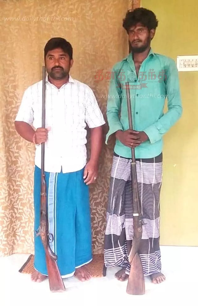 வனவிலங்குகளை வேட்டையாட நாட்டுத்துப்பாக்கி வைத்திருந்த கோழிப்பண்ணை உரிமையாளர் உள்பட 2 பேரை போலீசார் கைது செய்தனர். மேலும் இதுதொடர்பாக 2 பேரை போலீசார் வலைவீசி தேடி வருகிறார்கள்.
