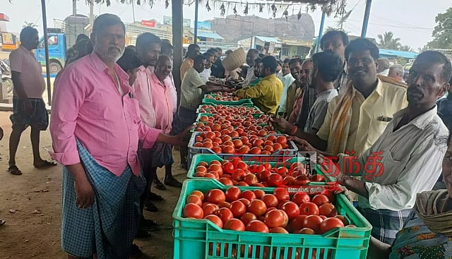 இந்த மார்க்கெட்டில் தினமும் 10 முதல் 15 டன் வரை தக்காளி விற்பனை செய்யப்படுகிறது. தக்காளியை வாங்குவதற்க்காக சென்னை, மதுரை, புதுக்கோட்டை, தஞ்சாவூர், கோவை, சேலம், கரூர், திண்டுக்கல் உட்பட பல்வேறு மாவட்டங்களில் இருந்து வியாபாரிகள் வாங்கி செல்கின்றனர். கடந்த வாரம் 25 கிலோ கொண்ட ஒரு பெட்டி தக்காளி ரூ.500 முதல் 600 வரை விற்பனை செய்யப்பட்டது.