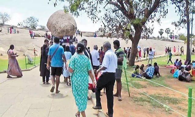 செங்கல்பட்டு மாவட்டம் மாமல்லபுரம் நகரம் சர்வதேச அளவில் யுனெஸ்கோவால் அறிவிக்கப்பட்ட உலக புராதன நகரமாக திகழ்வதால் நாள்தோறும் நூற்றுக்கணக்கான சுற்றுலா பயணிகள் வருகை தருகின்றனர். இந்த நிலையில் தற்போது கோடைகாலம் மற்றும் பள்ளிகளுக்கு கோடை விடுமுறை விடப்பட்டதை முன்னிட்டு மாமல்லபுரத்திற்கு உள்நாட்டு பயணிகள் வருகை அதிகரித்து காணப்படுகிறது. நேற்று கோடை விடுமுறையின் ஞாயிற்றுகிழமை என்பதாலும், இன்னும் 2 வாரங்களில் கோடை விடுமுறை முடிந்து பள்ளிகள் திறக்கப்பட உள்ளதால் ஏராளமான சுற்றுலா பயணிகள் குடும்பத்துடன் அரசு பஸ்களிலும் சுற்றுலா வாகனங்களிலும் கூட்டம், கூட்டமாக வந்து இருந்ததை காண முடிந்தது. கடற்கரை கோவில் ஐந்தரதம், வெண்ணை உருண்டைக்கல் போன்ற புராதன பகுதிகள் மக்கள் கூட்டத்தால் களைகட்டி காணப்பட்டது. அங்குள்ள பாறை சிற்பங்களை ரசித்து பார்த்து புகைப்படம் எடுத்து மகிழ்ந்தனர்.