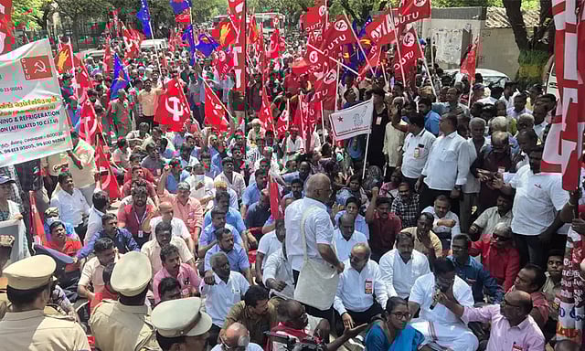 இந்த நிலையில் சென்னையில் அனைத்து தொழிற்சங்கங்கள் சார்பில் போரட்டம் நடைபெற்று வருகிறது சென்னை கிண்டி பேருந்து நிலையம் அருகே அனைத்து தொழிற்சங்கங்கள் சார்பில் மத்திய அரசை கண்டித்து பல்வேறு தொழிற்சங்கத்தினர் போராட்டத்தில் ஈடுபட்டு வருகின்றனர்.