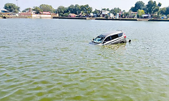 இதனால் அவரது கணவர், மனைவிக்கு கல்லல் தெப்பக்குளம் பகுதியில் வரும்போது கார் ஓட்ட கற்றுக்கொடுத்ததாக தெரிகிறது. அப்போது அவரது மனைவி பிரேக் பிடிப்பதற்கு பதிலாக ஆக்சிலேட்டரை வேகமாக மிதித்ததாக கூறப்படுகிறது. இதனால் திடீரென கார் கட்டுப்பாட்டை இழந்து தெப்பக்குளத்தில் இருந்த படித்துறை வழியாக இறங்கி தண்ணீரில் விழுந்தது. தெப்பக்குளத்தில் தண்ணீர் அதிகளவு இருந்தது.