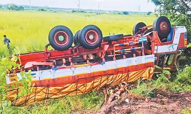 திருவள்ளூரில் இருந்து விழுப்புரம் நோக்கி மது பாட்டில்களை ஏற்றி கொண்டு லாரி ஒன்று சென்று கொண்டிருந்தது. அந்த லாரி செங்கல்பட்டு மாவட்டம் மதுராந்தகத்தை அடுத்த பாக்கம் என்ற இடத்தில் செல்லும்போது டிரைவரின் கட்டுப்பாட்டை இழந்து சாலையோர பள்ளத்தில் கவிழ்ந்து விபத்துக்குள்ளானது.