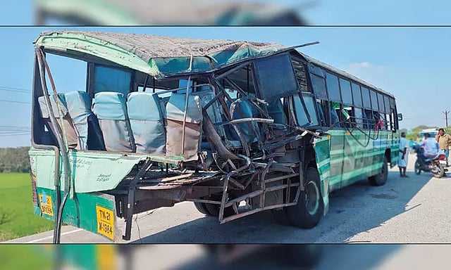 திருவள்ளூர் மாவட்டம், திருத்தணி அரசு போக்குவரத்து பணிமனையில் இருந்து தடம் எண் 97 என்ற பஸ், திருத்தணியில் இருந்து கனகம்மாசத்திரம் வழியாக திருவள்ளூர் வரை இயக்கப்படுகிறது. வழக்கம் போல் நேற்று காலை 8:20 மணிக்கு சுமார் 80 பயணிகளுடன் திருத்தணி அண்ணா பஸ் நிலையத்திலிருந்து இந்த பஸ் புறப்பட்டது. பஸ்சில் கண்டக்டராக ஏழுமலை, ஓட்டுனராக ராஜா ஆகியோர் பணியில் இருந்தனர். இ்ந்த பஸ் காலை 9 மணியளவில் சென்னை- திருப்பதி தேசிய நெடுஞ்சாலையில் உள்ள லட்சுமாபுரம் சாலை வளைவில் சென்று கொண்டிருந்தபோது, பின்னால் வந்த டிப்பர் லாரி பஸ் மீது பயங்கராமாக மோதியது. இதில் பஸ்சின் பின்புறம் அப்பளம் போல் நொறுங்கியது.