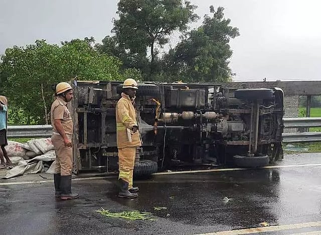 செஞ்சியிலிருந்து விழுப்புரம் நோக்கி சிமெண்டு லோடு ஏற்றிக் கொண்டு நேற்று காலை லாரி ஒன்று வந்து கொண்டிருந்தது. லாரியை ஏமப்பூரை சேர்ந்த சங்கர் (வயது 38) என்பவர் ஓட்டி சென்றார். இவருடன் கண்டமானடியை சேர்ந்த கிருஷ்ணமூர்த்தி (45) என்பவரும் வந்தார். லாரி, விக்கிரவாண்டி அருகே நந்திவாடி கூட்ரோடு அருகே வரும் போது மழை பெய்து கொண்டிருந்தது. அப்போது, திடீரென கட்டுப்பாட்டை இழந்த லாரி, சாலையில் கவிழ்ந்து விபத்துக்குள்ளானது.