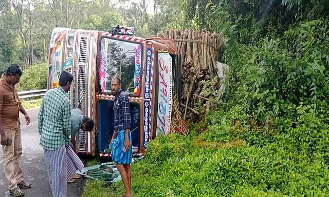 கூடலூர் பகுதியில் கூட்டுறவு மற்றும் தனியார் தேயிலை தொழிற்சாலைகள் உள்ளன. இங்கு விவசாயிகளிடம் இருந்து கொள்முதல் செய்யப்படும் பச்சை தேயிலையை அரைத்து தேயிலைத்தூளாக மாற்றுவதற்கு விறகுகள் பயன்படுத்தப்படுகிறது. இதனால் சமவெளி பகுதியில் இருந்து லாரிகளில் விறகுகள் கொண்டு வரப்படுகிறது, இந்தநிலையில் கேரளாவில் இருந்து விறகுகள் ஏற்றிக்கொண்டு லாரி ஒன்று தேவர்சோலை வழியாக கூடலூர் வந்து கொண்டிருந்தது. அப்போது சர்க்கார் மூலா பகுதியில் சாலையோரம் லாரி சென்ற போது திடீரென பாரம் தாங்காமல் கவிழ்ந்து விபத்துக்குள்ளானது. டிரவர் லேசான காயத்துடன் உயிர் தப்பினார். தகவல் அறிந்த தேவர்சோலை போலீசார் விரைந்து வந்து பார்வையிட்டனர். சாலையின் இடது புறம் கவிழ்ந்ததால் எந்த பாதிப்பும் ஏற்பட வில்லை. தொடர்ந்து லாரியை நிலை நிறுத்தும் பணியில் போலீசார் மற்றும் பொதுமக்கள் ஈடுபட்டனர். பின்னர் பல்வேறு கட்ட முயற்சிக்குப் பிறகு லாரி நிலை நிறுத்தப்பட்டது.