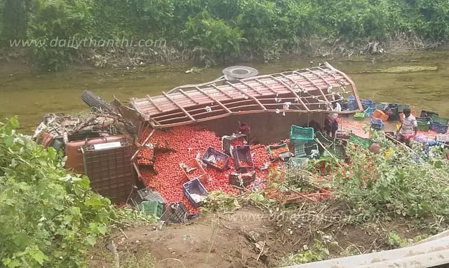 திருச்சி மாவட்டம், சிறுகாம்பூர் அருகே திருச்சி - நாமக்கல் நெடுஞ்சாலையில் கும்பகோணத்தில் இருந்து கோயமுத்தூர் நோக்கி பஞ்சு மூட்டை ஏற்றி வந்த லாரியும், எதிரே பெங்களூரில் இருந்து திருச்சி நோக்கி தக்காளி ஏற்றி வந்த லாரியும் நேருக்கு நேர் மோதிக்கொள்வது போல் வந்ததால், டிரவர்கள் பிரேக் பிடித்தனர். இதில் கட்டுப்பாட்டை இழந்த ஒரு லாரி சாலையோர பள்ளத்திலும், மற்றொரு லாரி அய்யன் வாய்க்காலுக்குள்ளும் கவிழ்ந்தன. இதில் 2 டிரைவர்களும் அதிர்ஷ்டவசமாக உயிர் தப்பினர். இது குறித்து வாத்தலை போலீசார் வழக்குபதிந்து விசாரணை மேற்கொண்டு வருகின்றனர்.
