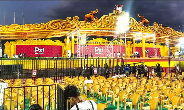 அதன் இருபுறமும், 40-க்கும் மேற்பட்ட போக்கஸ் விளக்குகள் பொருத்தப்பட்டு உள்ளன. விஜய் மேடையில் நடந்து வரும்போது, முதல் அடுக்கில் பவுன்சர்கள், 2-வது அடுக்கில் போலீசார் என இரண்டடுக்கு பாதுகாப்பு ஏற்பாடும் உள்ளது.