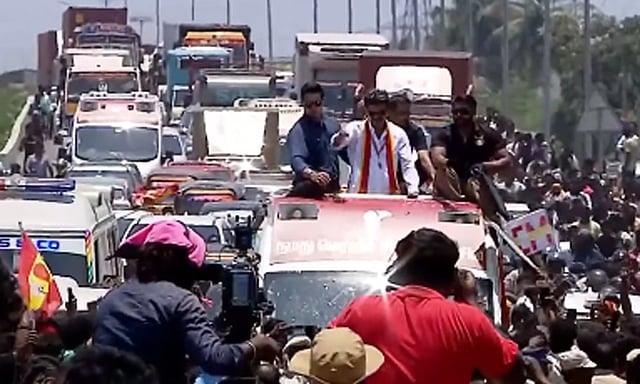 சாலையில் வாகனத்தில் நகர்வலமாக சென்று விஜய் வாக்குசேகரிப்பில் ஈடுபட்டு வருகின்றனர். விஜய்க்கு சாலையின் இருபுறமும் திரண்டு தவெக தொண்டர்கள், பொதுமக்கள் உற்சாக வரவேற்பு அளித்து வருகின்றனர்.