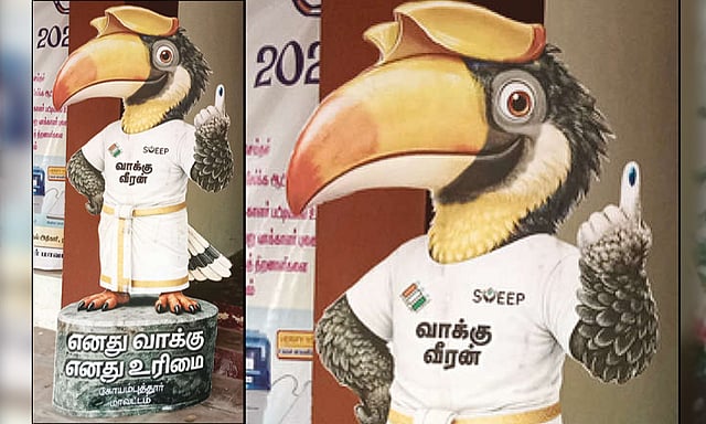 இந்த நிலையில் தமிழக சட்டமன்ற தேர்தலையொட்டி வாக்குப்பதிவு குறித்து விழிப்புணர்வு ஏற்படுத்தப்பட்டு வருகிறது. 'என் வாக்கு என் உரிமை' என்பதையும் வலியுறுத்தி அனைவரும் தவறாமல் வாக்களித்து ஜனநாயக கடமையை நிறைவேற்ற வேண்டும் என்ற விழிப்புணர்வை ஏற்படுத்தும் வகையில் இருவாச்சி பறவை உருவத்தை வாக்கு வீரன் என்ற பெயரில் தாலுகா அலுவலகத்தின் நுழைவு வாயில் பகுதியில் வைத்துள்ளனர். இந்த தேர்தல் விழிப்புணர்வு பொம்மை அனைவரையும் கவர்ந்துள்ளது.