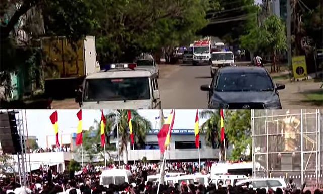 தவெக தலைவர் விஜய் இன்று காரைக்குடியில் தேர்தல் பிரசாரம் மேற்கொள்ள திட்டமிட்டு இருந்தார். இதற்காக சென்னையில் இருந்து தனி விமானம் மூலம் மதுரை வந்த விஜய், அங்கிருந்து தனது பிரசார வேனில் பயணித்தபடி ரோடு ஷோவாக வந்தார்.