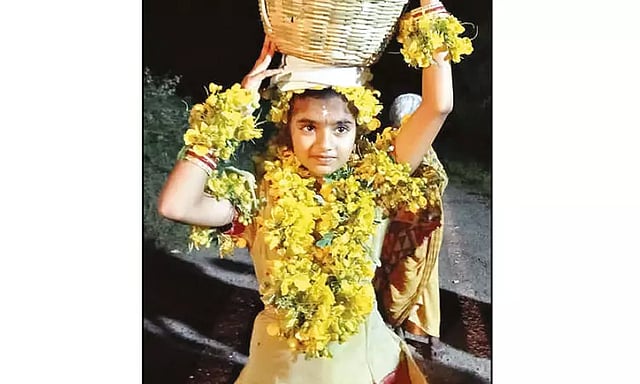 தொடர்ந்து பெண்கள் மாவிளக்கு எடுத்து வந்து குடிசையில் இருந்த சிறுமியை வெளியே அழைத்து வந்தனர். நேற்று அதிகாலை 4 மணிக்கு ஆவாரம் பூ வைத்திருந்த கூடையை சிறுமி தலையில் வைத்து சுமந்தபடி ஊர் எல்லையில் உள்ள கோவில் கிணற்றுக்கு அழைத்து சென்றனர்.