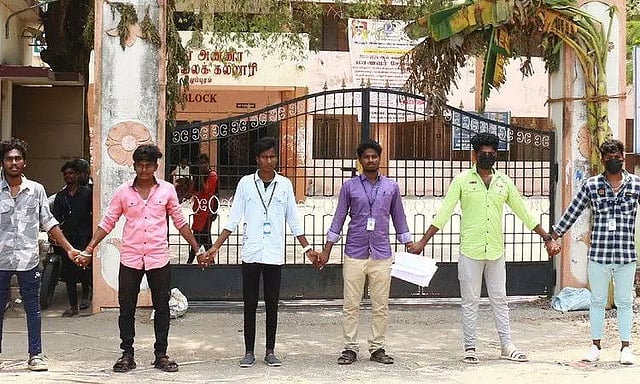 இந்த தேர்வு முடிவில் ஏற்பட்ட குளறுபடியால் மாணவர்கள் மத்தியில் பெரும் குழப்பம் உருவானது. இதுதொடர்பாக மாணவர்கள், பல்கலைக்கழகத்தில் புகார் அளித்தும் உரிய நடவடிக்கை எடுக்காததால் பாதிக்கப்பட்ட மாணவர்கள், நேற்று விழுப்புரம் அரசு கலை அறிவியல் கல்லூரி நுழைவுவாயில் முன்பு நின்று ஒருவருக்கொருவர் கைகோர்த்துக்கொண்டு திடீரென மனித சங்கிலி போராட்டத்தில் ஈடுபட்டனர்.