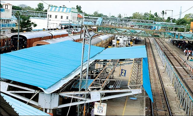 மழை ஓய்ந்ததை தொடர்ந்து நேற்று காலை, ரெயில் நிலையத்தில் மீண்டும் புதிய மேற்கூரைகள் அமைக்கும் பணி நடந்தது.