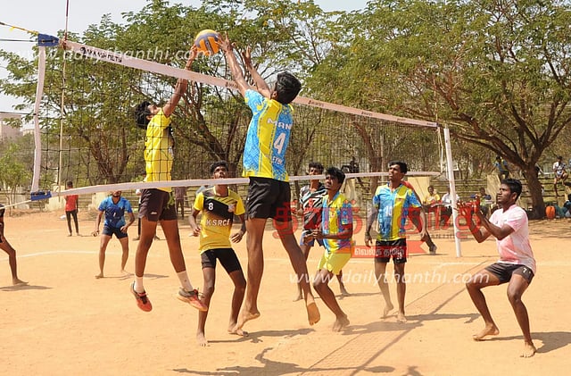 நாமக்கல்லில் முதல்-அமைச்சர் கோப்பைக்கான விளையாட்டு போட்டிகள் நடந்து வருகிறது. அதன்படி நேற்று நடந்த கல்லூரி மாணவர்களுக்கான கைப்பந்து போட்டியில் மாணவர்கள் ஆர்வமுடன் பங்கேற்று விளையாடியதை படத்தில் காணலாம்.