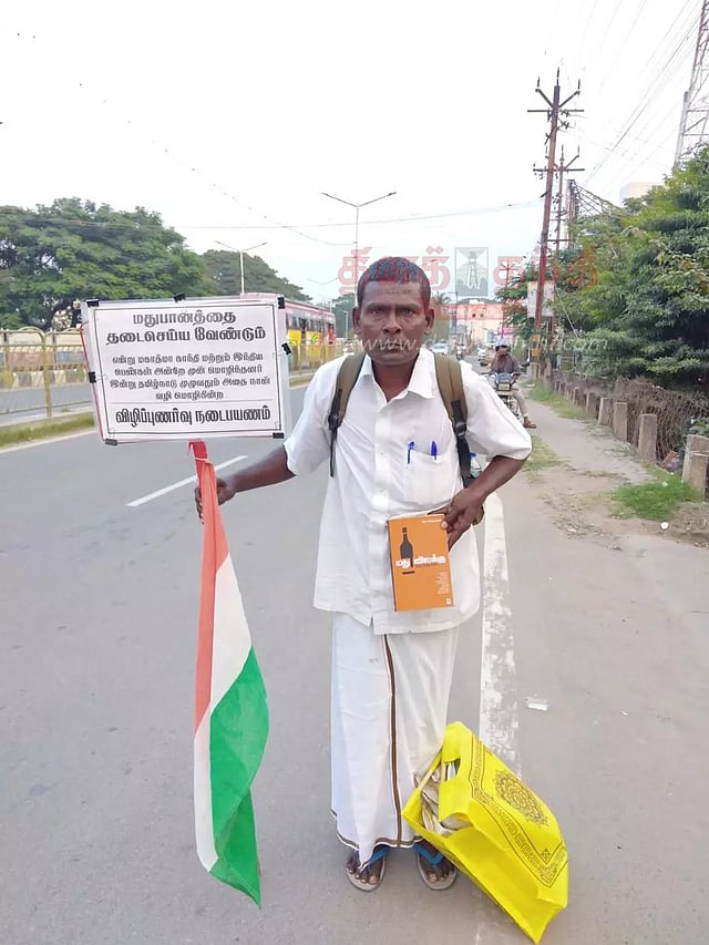 மதுரை மாவட்டம் டி.வாடிப்பட்டியை சேர்ந்தவர் கருப்பையா (வயது 53). காந்தியவாதியான இவர், இந்தியாவில் மதுவிலக்கு உடனடியாக அமல்படுத்த வேண்டும், உடலுக்கு தீங்கு விளைவிக்கும் மதுபானம், போதை பொருட்களை தடை செய்ய வேண்டும் உள்ளிட்ட கோரிக்கையை வலியுறுத்தி தமிழகம் முழுவதும் தேசிய கொடியுடன் நடைபயணம் மேற்கொண்டு வருகிறார். திருச்சியில் கடந்த மாதம் 9-ந் தேதி நடைபயணத்தை மேற்கொண்ட அவர், புதுச்சேரி, சென்னை, விழுப்புரம், கள்ளக்குறிச்சி வழியாக சேலம் வந்தார். பின்னர் அவர் சேலம் 4 ரோடு, புதிய பஸ்நிலையம், சூரமங்கலம் உள்ளிட்ட பல்வேறு பகுதிகளில் நடந்து சென்று மதுவிலக்கு வேண்டி மக்களிடம் விழிப்புணர்வு ஏற்படுத்தினார். ஈரோட்டில் குடியரசு தினத்தன்று பயணத்தை முடிக்கிறார். 48 நாட்கள் நடைபயணத்தை மேற்கொள்ளும் கருப்பையா, மொத்தம் 800 கிலோ மீட்டர் தூரம் நடந்து செல்கிறார்.