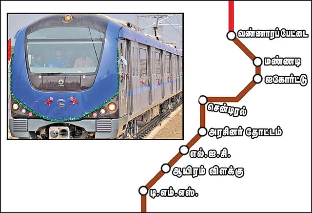 மேலும் மெட்ரோ ரெயில் சேவையை நீட்டிக்கும் பணிகள் நடைபெற்று வருகின்றன. அந்த வகையில் வண்ணாரப்பேட்டை- டி.எம்.எஸ். இடையே 10 கி.மீ. தொலைவுக்கு சுரங்கப்பாதையில் மெட்ரோ ரெயில் வழித்தடம் அமைக்கப்பட்டது. இந்த வழித்தடத்தில் ஆயிரம் விளக்கு, எல்.ஐ.சி., அரசினர் தோட்டம், சென்டிரல், ஐகோர்ட்டு, மண்ணடி ஆகிய 6 மெட்ரோ ரெயில் நிலையங்கள் வருகின்றன.