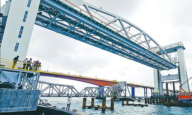 ராமநாதபுரம் பாம்பன் கடலின் நடுவே ரூ.545 கோடியில் புதிதாக ரெயில் பாலம் கட்டி முடிக்கப்பட்டுள்ளது. கடலுக்குள் சுமார் 2 கிலோ மீட்டர் தூரம் அமைக்கப்பட்டுள்ள இந்த பாலத்தின் மையப் பகுதியில் 77 மீட்டர் நீளமும், 650 டன் எடையும் கொண்ட செங்குத்து வடிவிலான திறந்து மூடும் தூக்குப்பாலம் உள்ளது.
