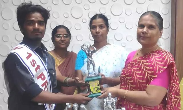 இதனை தொடர்ந்து மாநில அளவில் நடைபெற்ற பளுதூக்கும் போட்டியில் வெற்றி பெற்று சாதனை படைத்த மாணவனுக்கு பாராட்டு விழா கல்லூரி வளாகத்தில் நேற்று காலை நடைபெற்றது. விழாவிற்கு கல்லூரி முதல்வர் சே.ப. நசீம் ஜான் தலைமை தாங்கி, மாணவன் ஏ.ஜெயராமனுக்கு பரிசு கேடயம், பாராட்டு சான்றிதழ் வழங்கினார். இதில் கல்லூரி பேராசிரியர்கள், உடற்கல்வி இயக்குனர்கள், இளங்கலை, முதுகலை மாணவ, மாணவிகள் பலர் கலந்து கொண்டனர்.