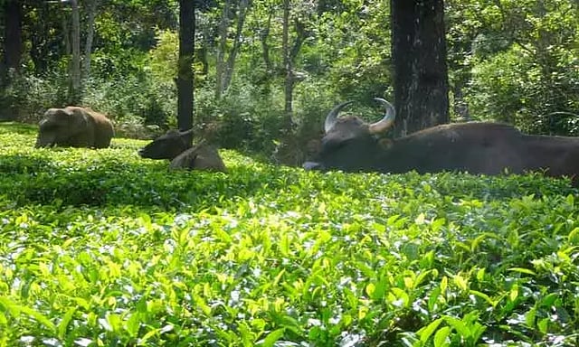 இந்த நிலையில் வால்பாறை-பொள்ளாச்சி சாலையில் லோயர் பாரளை எஸ்டேட் தேயிலை தோட்ட பகுதியில் காட்டு யானை ஒன்றும், காட்டெருமை குட்டிகளுடன் முகாமிட்டு நின்றன. யானையும், காட்டெருமைகளும் ஒன்றாக தேயிலை தோட்டத்தில் முகாமிட்டு இருந்ததால் தேயிலை தோட்ட தொழிலாளர்கள் பீதியடைந்தனர். மேலும் அந்த வழியாக சென்ற சுற்றுலா பயணிகள் இதனை ஆச்சரியத்துடன் பார்த்து சென்றனர்.