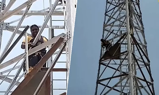 கரூரில் செல்போன் டவர் மீது ஏறி தற்கொலை மிரட்டல் விடுத்து வரும் பெண்ணை காப்பாற்றும் முயற்சியில் போலீசார் மற்றும் தீயணைப்பு துறையினர் ஈடுபட்டுள்ளனர்.