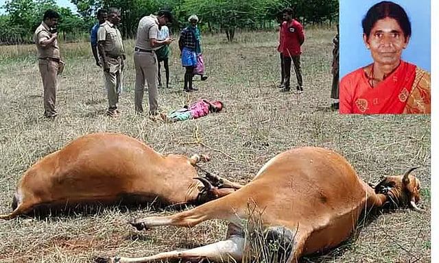 திண்டுக்கல் மாவட்டம் எரியோடு அருகே உள்ள கொங்கர்குளத்தை சேர்ந்தவர் துரை. இவரது மனைவி தேவி (வயது 55). இவர்களுக்கு குழந்தைகள் இல்லை. கடந்த சில ஆண்டுகளுக்கு முன்பு துரை இறந்துவிட்டார். தேவி மட்டும் தோட்டத்து வீட்டில் தனியாக வசித்து வந்தார். அங்கு 2 பசு மாடுகளை வளர்த்து வந்தார்.