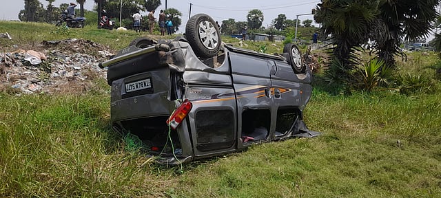 அப்போது பின்னால் வேகமாக லாரி ஒன்று வந்து கொண்டிருந்தது. எதிர்பாராதவிதமாக லாரி முன்னால் சென்ற கார் மீது வேகமாக மோதியது. இதில் கார் கட்டுப்பாட்டை இழந்து சாலையோரம் இருந்த பள்ளத்தில் தலைகுப்புற கவிழ்ந்து விபத்துக்குள்ளானது.