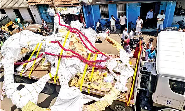 இந்த சிலையை நேற்று இந்திரா காந்தி தேசிய கலை மைய தலைவர் ஆர்த்தல் பாண்டியா தலைமையில், மைய அலுவலர்கள் ஜவகர் பிரசாத், மனோகன் தீட்சத் ஆகியோர் பெற்றுக் கொண்டனர். இதையடுத்து சிலை டெல்லிக்கு கண்டெய்னர் லாரியில் அனுப்பி வைக்கப்பட்டது.