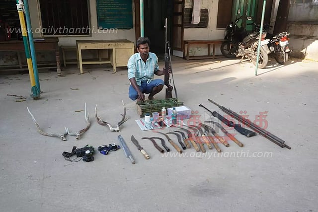 அப்பேது அதேப் பகுதியை சேர்ந்த ஏழுமலை (வயது 31) என்பவர் தனது வீட்டில் இரண்டு நாட்டு துப்பாக்கிகள், இரண்டு புள்ளி மான்களின் கெம்புகள், வெட்டுக்கத்தி, வன பறவைகளைப் பிடிக்கும் கண்ணி வலைகள் மற்றும் துப்பாக்கியில் பயன்படுத்தும் வெடி மருந்துகள் ஆகியவை இருப்பது தெரியவந்தது. அதனை வனத்துறையினர் பறிமுதல் செய்து. இது தெடர்பாக வழக்குப் பதிவு செய்து ஏழுமலையை கைது செய்தனர்.