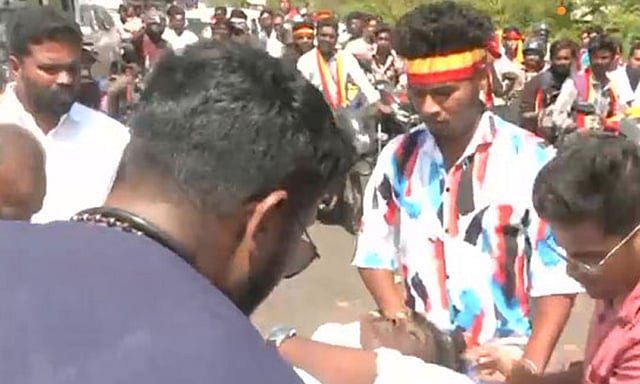 சில தவெக தொண்டர்கள் ஆர்வ மிகுதியில் விஜய்யின் வாகனத்தை பைக்கில் விரட்டி வந்தனர். ஹெல்மெட் அணியாமல், சாலை விதிகளை மதிக்காமல் ஆபத்தான முறையில் பலர் பைக்கில் பின்தொடர்ந்த நிலையில், தேசிய நெடுஞ்சாலையில் அடுத்தடுத்து சிலர் விபத்தில் சிக்கினர்.இதில் இளைஞர் ஒருவருக்கு பலத்த காயம் ஏற்பட்டது. உடனடியாக அவர் ஆம்புலன்சில் மருத்துவமனைக்கு அனுப்பி வைக்கப்பட்டார்.