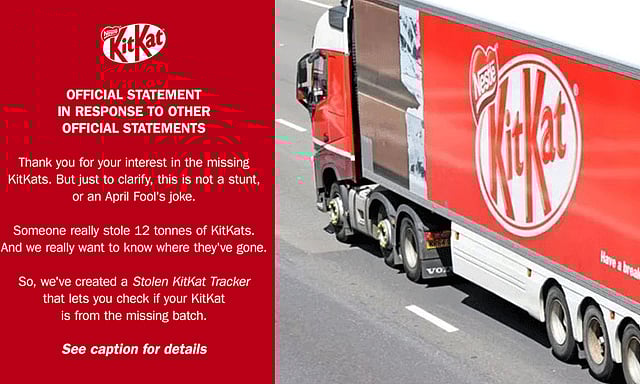இந்த நிலையில், இந்த திருட்டு குறித்து கிட்கேட் நிறுவனம் வெளியிட்ட அறிக்கையில், "காணாமல் போன கிட்கேட் சாக்லேட்டுகள் மீதான உங்கள் ஆர்வத்திற்கு நன்றி.. ஆனால் இது ஒரு சாகச செயலோ அல்லது ஏப்ரல் 1 முட்டாள்கள் தின நகைச்சுவையோ அல்ல, உண்மையிலேயே 12 டன் கிட்கேட் சாக்லேட்டுகள் திருடு போயுள்ளது. அவை எங்கே சென்றன? என்பதை நாங்கள் தெரிந்துகொள்ள விரும்புகிறோம்" என கிட்கேட் நிறுவனம் பதிவு செய்துள்ளது. இந்த சம்பவம், ஐரோப்பாவில் உணவு பொருட்கள் தொடர்பான பாதுகாப்பு குறித்து கேள்விகளை எழுப்பியுள்ளது.