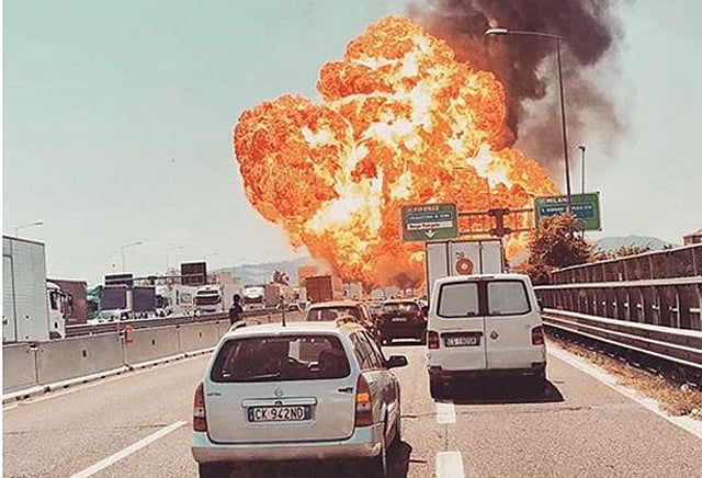 இத்தாலி நாட்டின் பொலாக்னா விமான நிலையம் அருகே பாலம் ஒன்றின் மீது கார்களை ஏற்றி கொண்டு லாரி ஒன்று சென்றது. தீப்பற்ற கூடிய பொருட்களை ஏற்றி கொண்டு சென்ற டேங்கர் லாரியின் மீது அது மோதியுள்ளது. இந்த சம்பவத்தில் லாரிகள் வெடித்து சிதறியுள்ளன. இதனால் ஏற்பட்ட தீயானது வான்வரை பரவியது.
