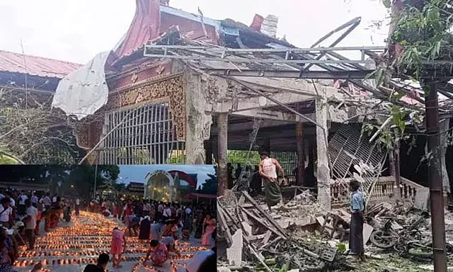 இந்நிலையில், அந்நாட்டின் சஹாயிங் மாகாணம் மவ்யா மாவட்டம் சாங்-யூ நகரம் மக்கள் பாதுகாப்புப்படை என்ற கிளர்ச்சியாளர்கள் கட்டுப்பாட்டில் உள்ளது. அந்த பகுதியில் கடந்த திங்கட்கிழமை இரவு பவுர்ணமியையொட்டி புத்தமத முக்கிய பண்டிகையான தடிங்யட் முழு நிலவு விழா கொண்டாடப்பட்டது. இதில் நூற்றுக்கணக்கான மக்கள் கலந்துகொண்டு மத வழிபாடு செய்தனர்.