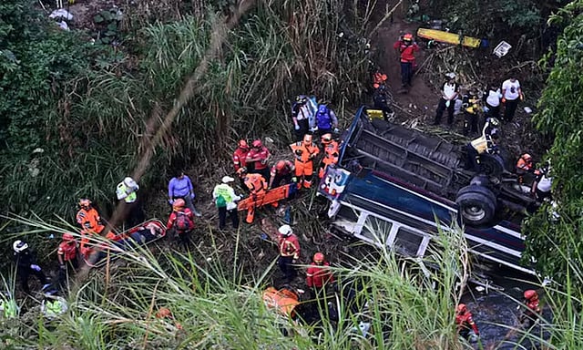 மத்திய அமெரிக்க நாடுகளில் ஒன்றான கவுதமலாவில் பஸ் பள்ளத்தாக்கில் கவிழ்ந்து விபத்து ஏற்பட்டுள்ளது. பாலத்தின் மீது சென்றுகொண்டிருந்த பஸ் சாலையோர தடுப்பின் மீது மோதி பள்ளத்தாக்கில் விழுந்தது. இதில் குறைந்தது 51 பேர் பலியானதாக மீட்புப் பணியாளர்கள் தெரிவித்துள்ளனர்.விபத்துக்குள்ளான பஸ் பாலத்தில் இருந்து கவிழ்ந்து கழிவுநீரால் மாசுபட்ட ஆற்றில் விழுந்துள்ளது70-க்கும் மேற்பட்டவர்களை ஏற்றிச் சென்ற பஸ் இடிபாடுகளில் இருந்து 51 பேரின் உடல்கள் மீட்கப்பட்டதாக மீட்புக்குழு தெரிவித்துள்ளது.