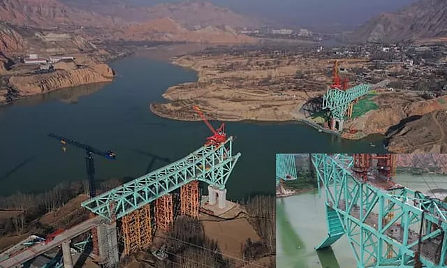 சீனாவின் கியூங்ஹாய் மாகாணத்தில் பாயும் யல்லோ ஆற்றில் ரெயில்வே பாலம் கட்டும் பணி நடைபெற்று வருகிறது.