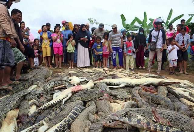 இந்தோனேஷிய கிராமவாசிகளால் கத்தி மற்றும் கோடரிகள் மூலம் ஒரே பண்ணையை சேர்ந்த சுமார் 300 முதலைகள் கொல்லப்பட்டன. தங்கள் உறவினரை கடித்து கொன்றதற்கு பழிக்குப்பழி வாங்குவதற்காக இந்த சம்பவம் நிகழ்ந்துள்ளது.