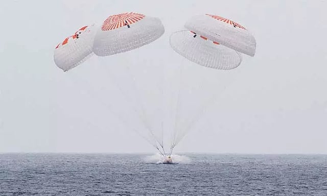 அதன்படி பூமி திரும்பிய இந்த குழு அமெரிக்காவின் கலிபோர்னியா கடற்பகுதியில் பாராசூட் மூலம் பத்திரமாக தரையிறங்கினர். இதனை அமெரிக்க விண்வெளி ஆராய்ச்சி நிறுவனமான நாசா நேரலையாக ஒளிபரப்பியது. இதனையடுத்து மருத்துவ பரிசோதனைக்காக அவர்கள் தனிமைப்படுத்தப்பட்டு உள்ளனர்.