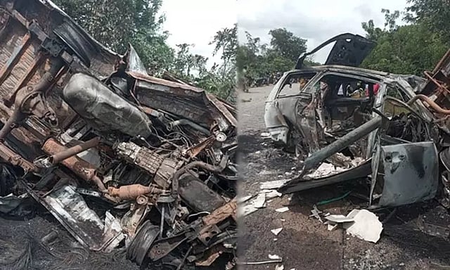 அப்போது, சாலையில் மறுபுறம் வேகமாக வந்த கார் மீது பஸ் மோதி விபத்துக்குள்ளானது. இந்த கோர விபத்தில் காரும், பஸ்சும் தீ பிடித்து எரிந்தது. தீ மளமளவென எரிந்ததால் கார் மற்றும் பஸ்சுக்குள் பலர் சிக்கிக்கொண்டனர்.