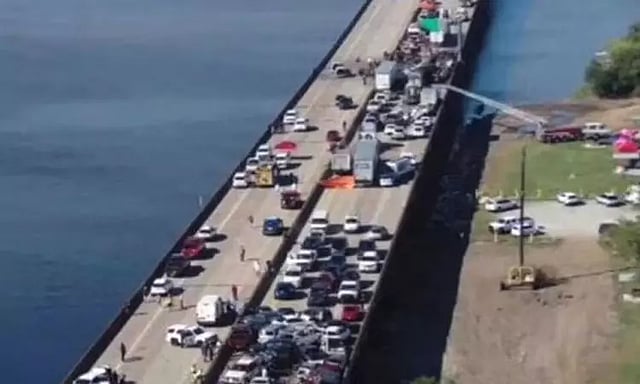 மூடுபனி காரணமாக எதிரே வந்த வாகனங்கள் தெரியாததால் முன்னால் வந்த கார் மீது அந்த லாரி மோதியது. இதில் அந்த டேங்கர் லாரியில் இருந்து வேதிப்பொருட்கள் கசிந்து மேலும் புகைமூட்டமாக மாறின. எனவே ஒன்றன்பின் ஒன்றாக 168 வாகனங்கள் மோதி பெரும் விபத்து ஏற்பட்டது.