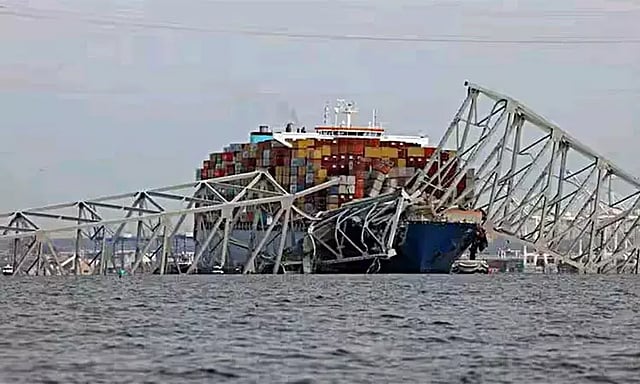 அமெரிக்காவின் மேரிலாண்ட் மாகாணம் பால்டிமோர் நகரில் படாப்ஸ்கோ ஆற்றின் குறுக்கே 'பிரான்சிஸ் ஸ்காட் கீ' என்ற மிகப்பெரிய பாலம் உள்ளது. 2 கி.மீ. தூரத்துக்கு 4 வழி பாதையாக அமைந்துள்ள இந்த பாலம் எப்போதும் பரபரப்பாக காணப்படும். கடந்த மார்ச் மாதம் 26-ந் தேதி படாப்ஸ்கோ ஆற்றில் சென்ற 'டாலி' என்ற மிகப்பெரிய சரக்கு கப்பல் 'பிரான்சிஸ் ஸ்காட் கீ' பாலம் மீது மோதியது.