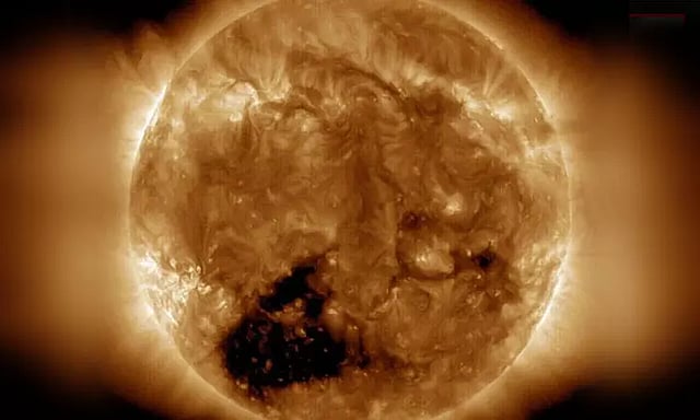 சூரியனில் பூமியை விட 20 மடங்கு பெரிய அளவிலான கருமையான பகுதி தென்படுகிறது. இது கரோனா ஓட்டை என விஞ்ஞானிகளால் அழைக்கப்படுகிறது. பார்ப்பதற்கு சூரியனின் ஒரு பகுதி காணாமல் போனது போன்று உள்ளது.