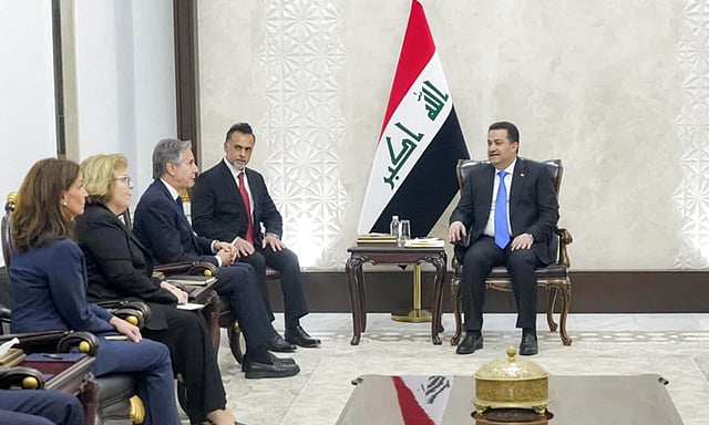 அமெரிக்க வெளியுறவுத்துறை மந்திரி ஆண்டனி பிளிங்கன் திடீர் பயணமாக இன்று ஈராக் சென்றார். தலைநகர் பாக்தாத் சென்ற பிளிங்கன் ஈராக் பிரதமர் முகமது அல் சுடனியை சந்தித்தார்.