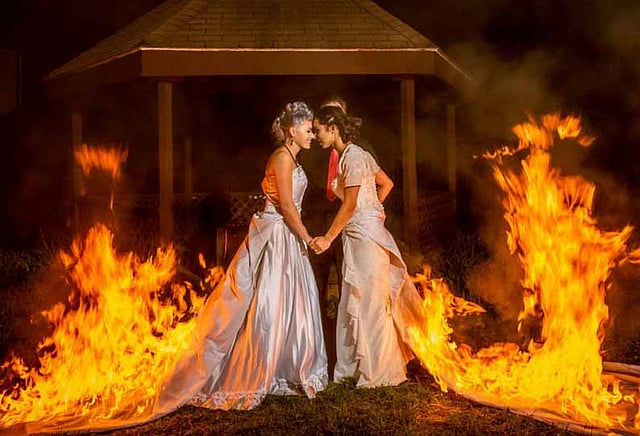 இதனை விசித்திரமாகக் கொண்டாட விரும்பிய அவர்கள் வெர்னான் என்ற குன்றுப் பகுதிக்குச் சென்றனர்.தொடர்ந்து தங்களது திருமண ஆடையில் தீ வைக்குமாறு கணவர்களைக் கேட்டுக் கொண்டனர். அதற்கு அவர்களும் சம்மதிக்கவே, ஆடையில் பற்றி எரியும் தீயைப் பற்றிக் கவலைப்படாமல் இருவரும் போஸ் கொடுத்தனர். அடுத்த சில நொடிகளில் தீப்பற்றிய மேலங்கி கழன்று விழுந்ததும், இருவரும் ஆனந்தமாக கொண்டாடினர்.