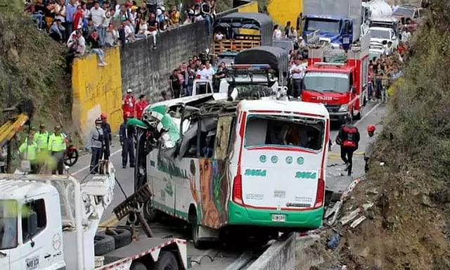 தென் அமெரிக்க நாடான கொலம்பியாவின் தென்மேற்கு பகுதியில் உள்ள துறைமுக நகரமாக டுமாகோவிற்கும் காலிக்கும் இடையே பேருந்து ஒன்று சென்றுகொண்டு இருந்தது. அப்போது ஓட்டுநரின் கட்டுப்பாட்டை இழந்த பேருந்து சாலையோரத்தில் கவிழ்ந்து விபத்துக்குள்ளானது.